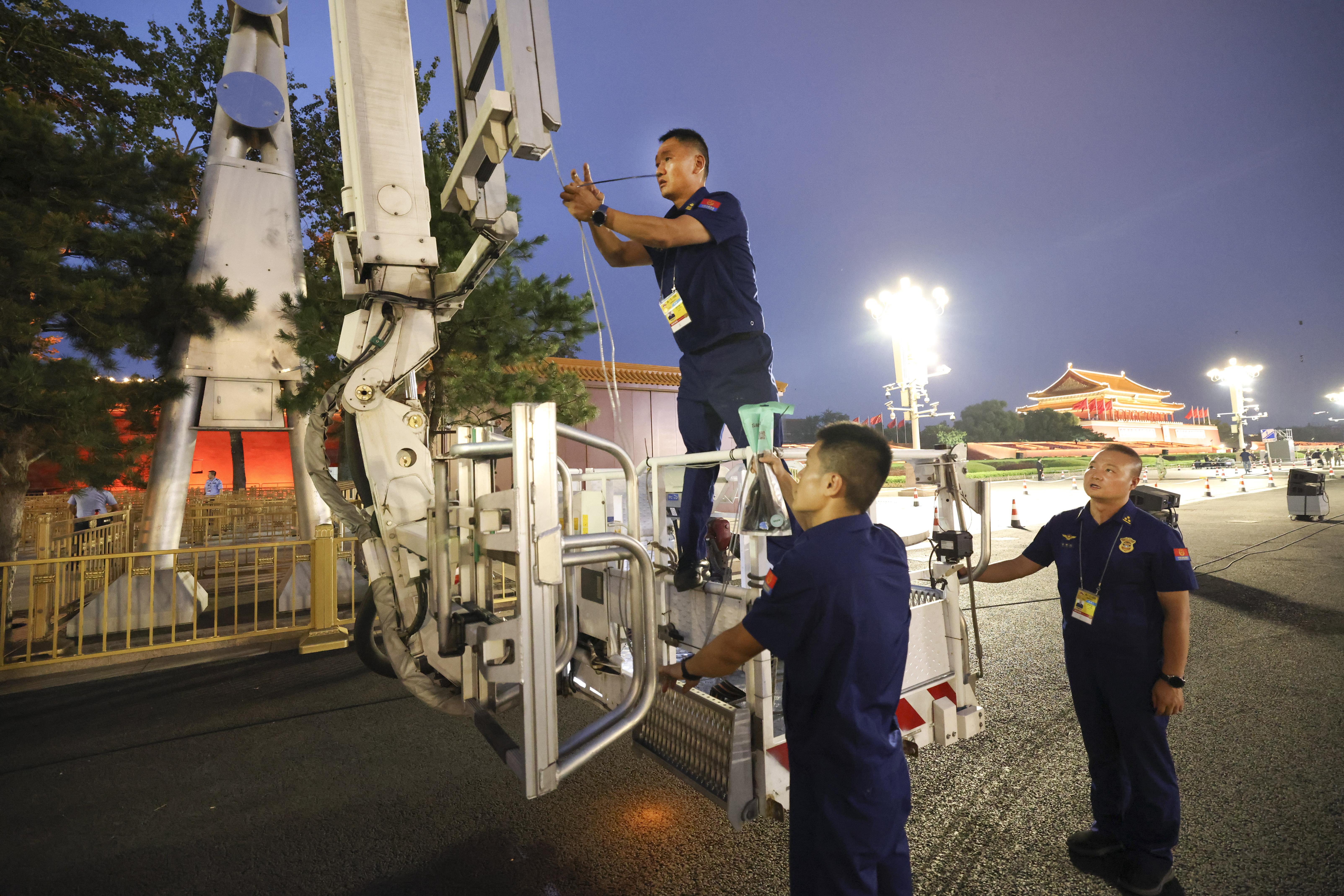 云梯車安全員程華杰今年23歲,安全是他心中最緊繃的弦。“最擔心的是刮風,高度越高,風力越大,云梯車工作斗的晃動就越大,當風力達到12.5米每秒,云梯車就會自動報警并停止工作,雖然可以手動解除限制,但我們一直期盼9月3日是一個晴朗微風的天氣。”