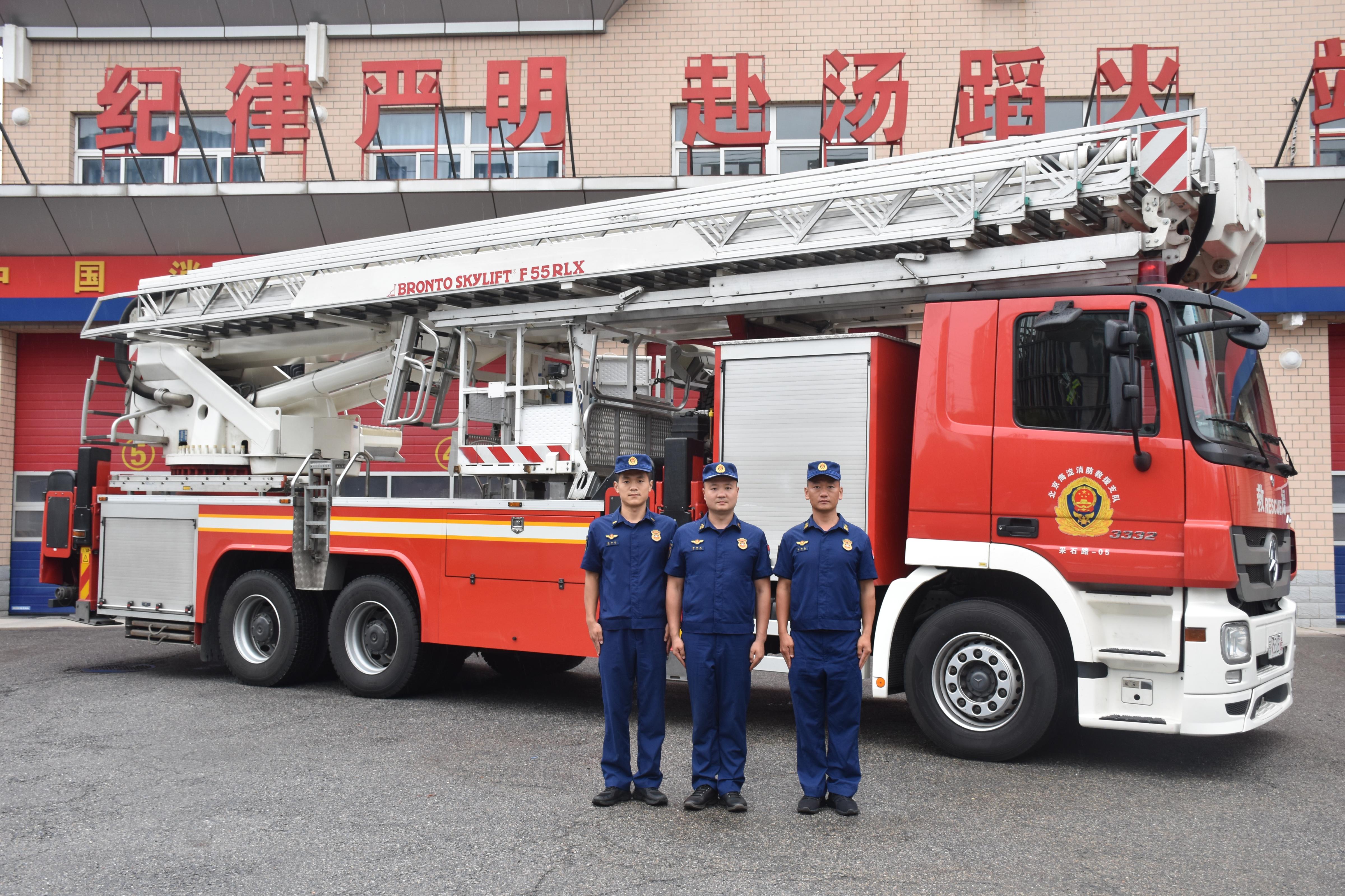 在消防站,三名消防員和特殊“隊友”云梯車合影。