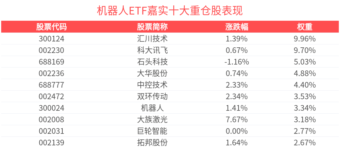 數據顯示,截至2025年6月30日,中證機器人指數前十大權重股分別為匯川技術、科大訊飛、石頭科技、大華股份、中控技術、雙環傳動、機器人、大族激光、巨輪智能、拓邦股份,前十大權重股合計占比49.58%。