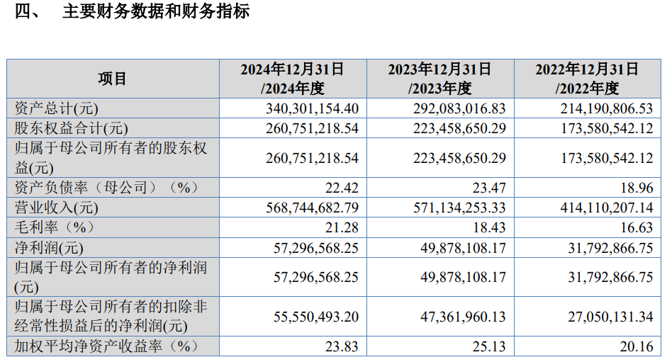 報告期內,公司實現營業收入4.14億元、5.71億元和5.69億元,凈利潤3,179.29萬元、4,987.81萬元和5,729.66萬元,總體呈增長趨勢。