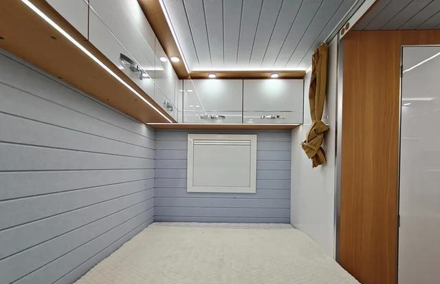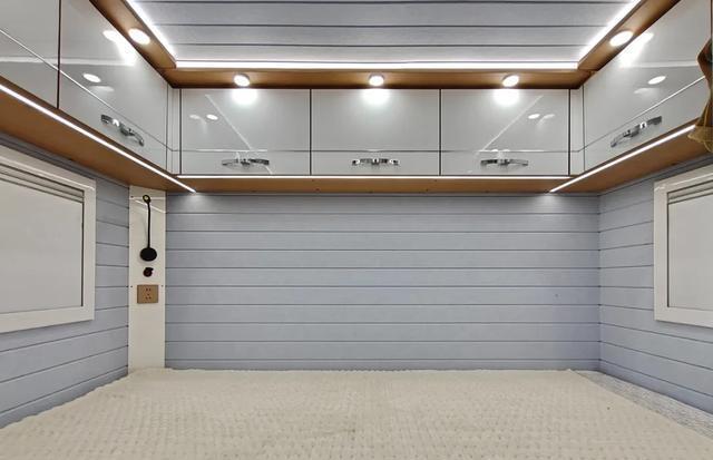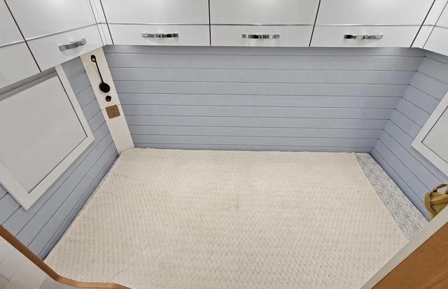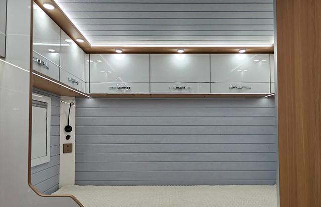 這張后床尺寸為2200×1300(mm),躺下兩名成年人足夠。這張床的床位高低適中,基本上一踮腳就能坐到床上,尤其是一些老年用戶,很容易就能上去。整個后床區域側方墻壁都采用了和額頭床一樣的吸音板材質,防潮、隔音,保溫。后床區域的儲物空間仍然豐富,包含一組“U”型吊柜組和床鋪下方的隱藏式儲物格。吊柜組的內置空間非常寬敞,并非擺設,足以用于收納衣服。