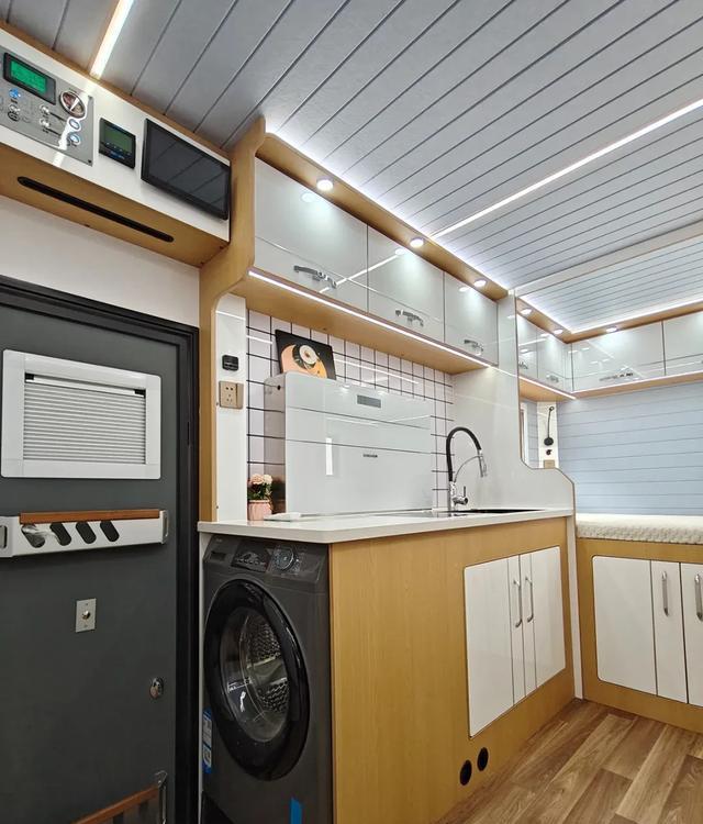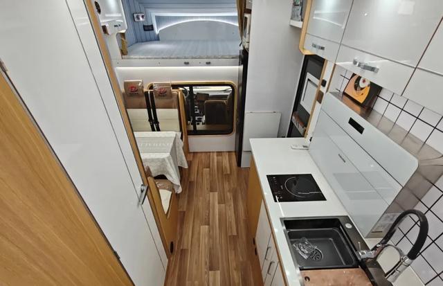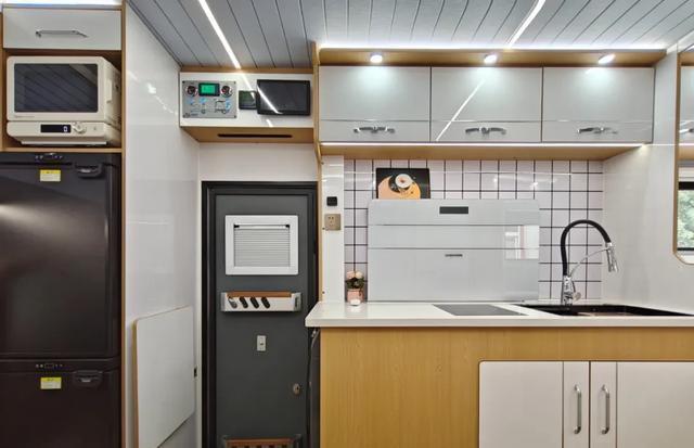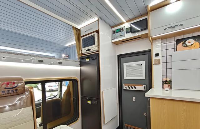 星空2號房車的內飾布局調整的地方在于廚房區域,中門又向前靠了一些。將廚房區又之前的分體廚房變成了一體式廚房,但是和廚房配套的冰箱集成柜單獨放在了副駕駛后方,由英得爾提供的152升冰箱。我們看到的這款房車的中門進行了選配增強處理,原車標配的是普通房車門,但是這款中門則是重卡房車上配備的比較厚重的門,保溫隔熱和隔音要好不少。