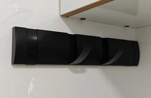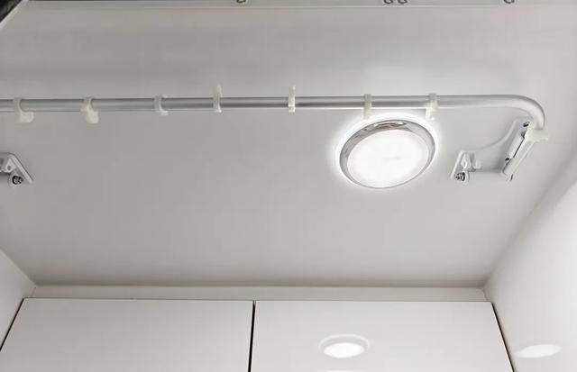 衛生間內部近似是正方形的設計,約為800mm的等寬,樣車內部配備的是便攜式馬桶,可以選裝固定馬桶。衛生間內的收納柜,獨立淋浴器以及換氣扇這些都是標配,還可以發現一個非常那個細節的小設備,頂部配備了一款掛衣鉤,中間利用限位器給分隔開了,平時洗完衣服比較容易掛。