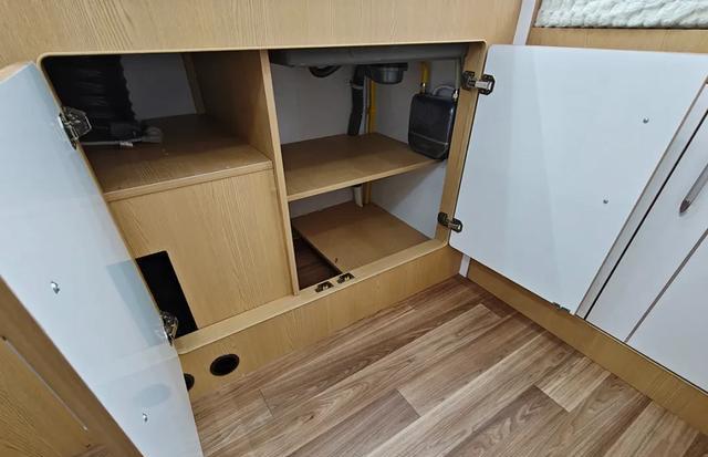 可以看到一體式的房車空間仍然不小,在沒有延伸板作為延展的請款下,整個操作臺的長度達到至少1.5米,車內做飯要方便的多。操作臺上還給配備了一款家用的大尺寸吸油煙機,這款吸油煙機的吸力確實比較給力,在如此大的房車空間內,油煙幾乎都能吸附進去。整個廚房區沒有設置抽屜,對開門的收納空間進行了分格處理。頂部還有三個獨立的頂部吊柜組。
