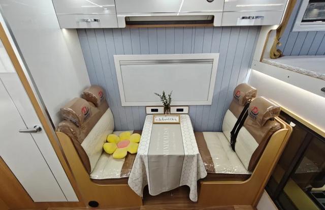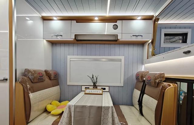 駕駛室后方是4人對卡座會客區,著重說一下這套沙發墊的組合,內部是羽絨填充,但是并不像我們穿的羽絨服那種蓬松感,縮上去偏柔軟,但是不會有觸底的生硬感。會客區頂部是兩個獨立吊柜夾一個家用空調的組合。