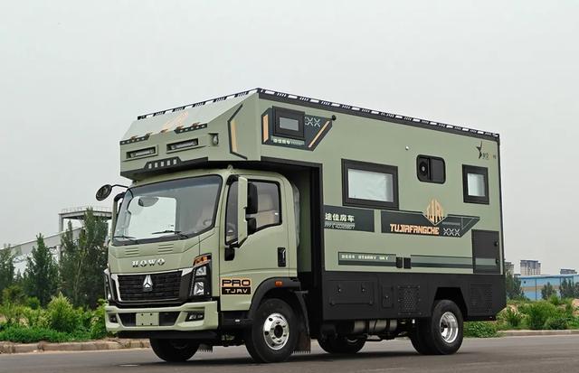 外觀方面,途佳這款豪沃統帥T5房車仍然采用的是軍綠色涂裝,硬朗的箱體造型,箱體板的拼接處采用金屬包邊。棱角分明的額頭造型使得它具有了一定越野房車的硬派風格。相對于之前的統帥T3房車來說,它的變化主要體現在動力方面、底盤調節的舒適性和油箱的容積方面,其他部分幾乎和T3是保持一致的。整車的外觀尺寸為5995×2550×3350(mm),長度6米之內,上藍牌,C本就能駕駛。