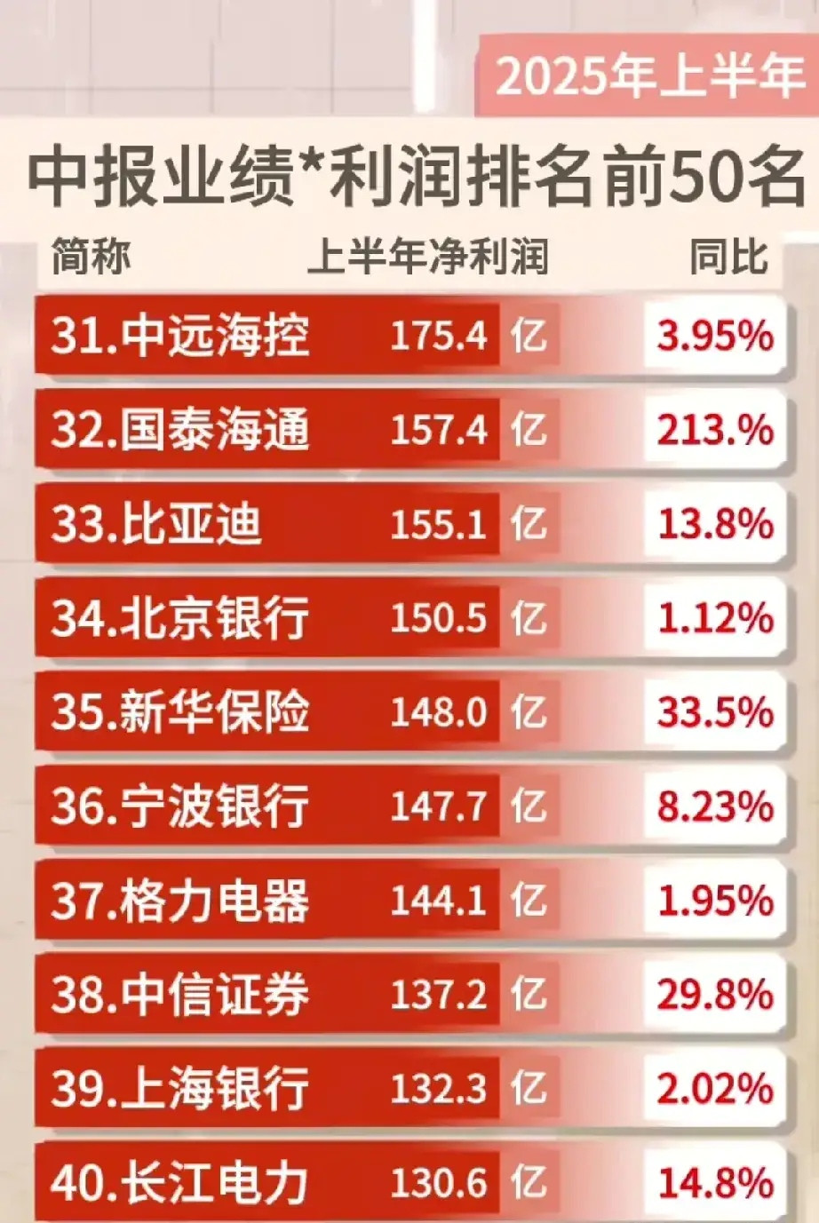 整體而言,2025年上半年利潤排名前50的企業中,既有傳統巨頭穩定貢獻利潤,也有新興力量或特定行業公司表現搶眼,業績分化明顯,增長與下滑并存。